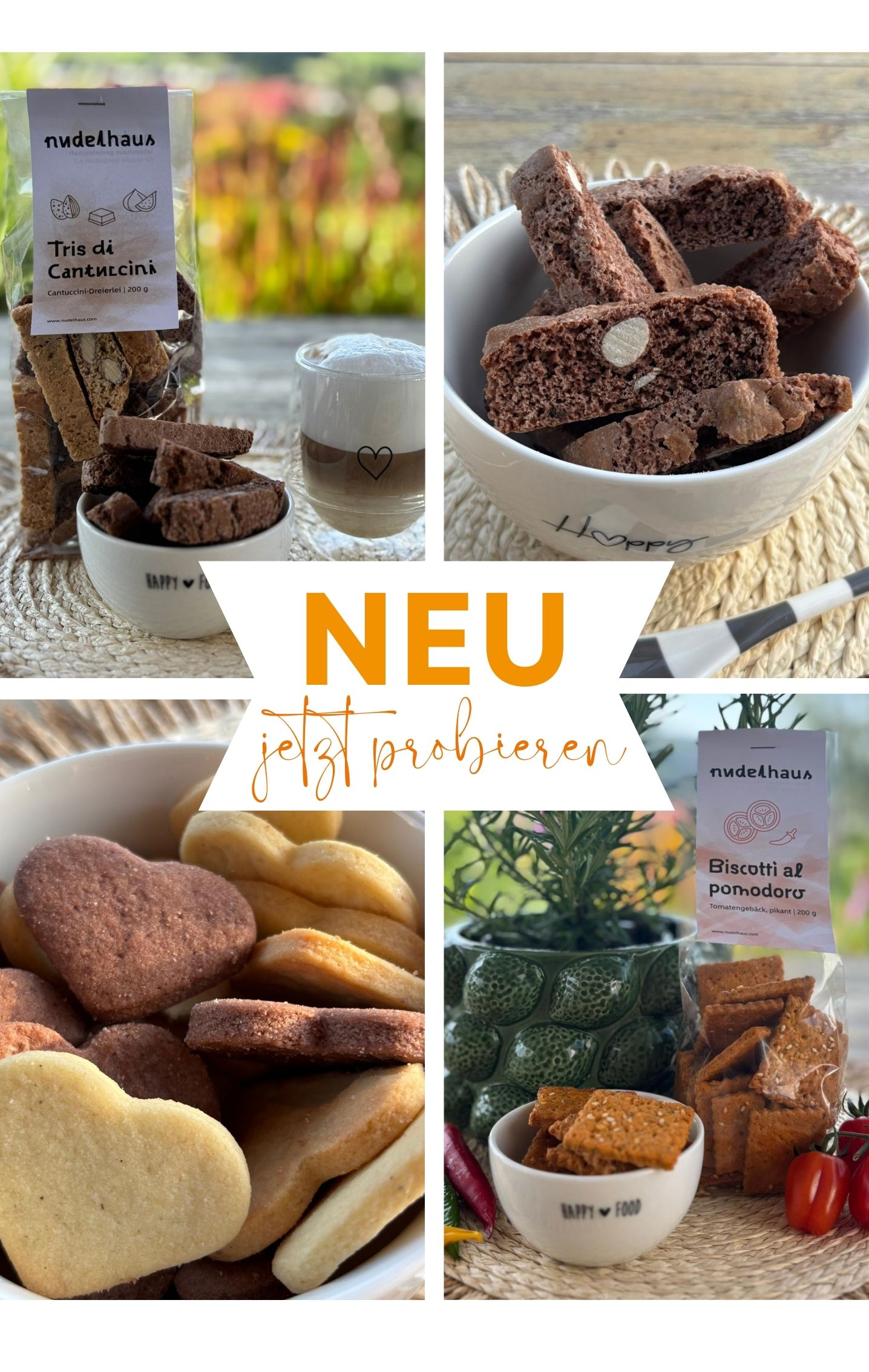 MIT VIEL SORGFALT, BESTEN ZUTATEN UND EINER PRISE KREATIVITÄT HABEN WIR UNSER SORTIMENT ERWEITERT. FREUEN SIE SICH AUF VIER NEUE GEBÄCKSPEZIALITÄTEN: Pikantes Tomatengebäck, Cantuccini Schokolade, Cantuccini Dreierlei und Feingebäck